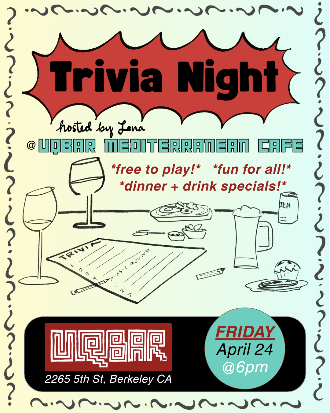 ABOUT UQBAR: UQBAR is a new cafe in West Berkeley serving fresh, Mediterranean food! For this event, UQBAR is serving a special happy hour and bar bites menu featuring their housemade dips and flatbread, plus deals on local beer and wine.